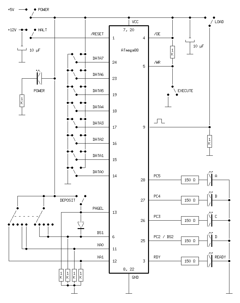 My interface doesn't expose the full functionality of the parallel programming interface. In particular, it doesn't provide a way to inspect memory contents. It would be possible to wire up eight LEDs above the switches, and figure out a way to interact safely with the bidirectional data bus. In my design, the switches force the lines to Vcc or ground with no protection at all. The output-enable signal is permanently tied high, so everything is fine in programming mode, but if you toggle in some software that configures one of these pins as an output you are likely to short-circuit the system.