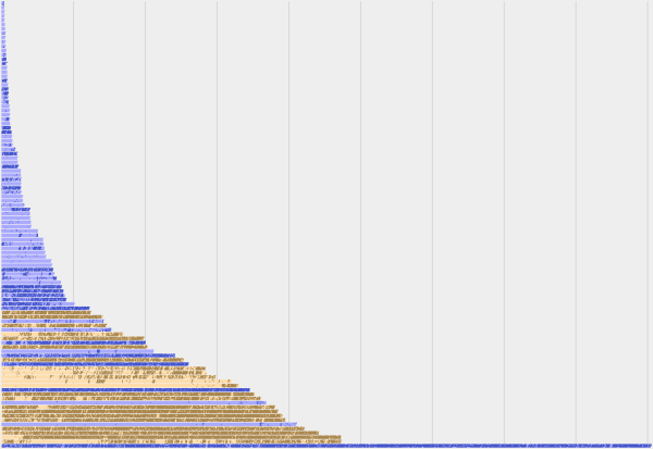Each command has been categorized as probably choice (light) or probably parser (dark). This classification can not be done with 100% accuracy, because the mode of input isn’t recorded in the transcript file—e.g. TAKE IT is often available as a clickable option, but it could equally well have been typed. The algorithm tends to err in favour of choice (light), which means that a speckled bar is consistent with a player who types everything in.